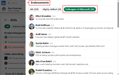 可以看到,技能不仅用于展示;它们还能得到你网络中的人认可,包括同事或有相似经验者。然而,认可只能来自你网络中的真实用户,也就是说认可是实名制的。