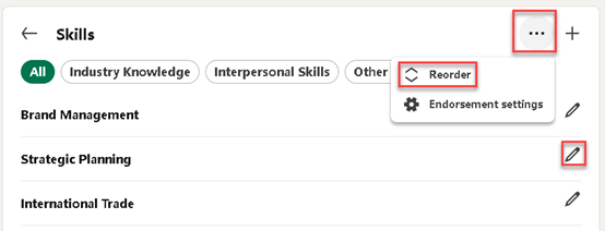 你可以随时编辑和重新排序你的技能。这一点至关重要!因为当别人访问你的档案时,默认只会展开显示排在最前面的2项技能。